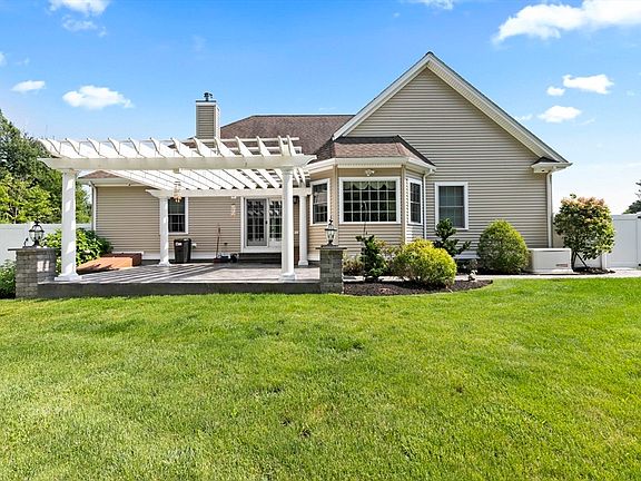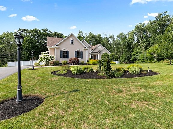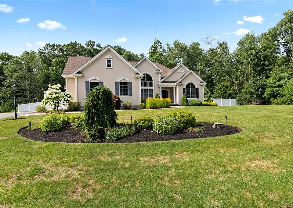 Step into this stunningly oversized contemporary all one floor living ranch with stately columns and a beautiful foyer. The 15 foot ceilings in the dining room and spacious living room, complete with a fireplace and French doors leading to the patio, will leave you in awe. The massive kitchen easily accommodates two chefs, boasts granite countertops, pot filler faucet, stainless steel appliances and a dining area. Other features include hardwood floors, central air, whole house generator & security system. The primary suite offers a full bath with a double vanity & a large walk-in closet. The beautifully finished basement provides plenty of additional space for a game room, children' s play area, or other possibilities. Enjoy the beautiful scenery under the pergola on the gorgeous patio overlooking approximately 2 acres of lush greenery. Additional amenities include a two-car garage, sprinkler system and decorative lighting. Conveniently located to Raynham Center & easy highway access