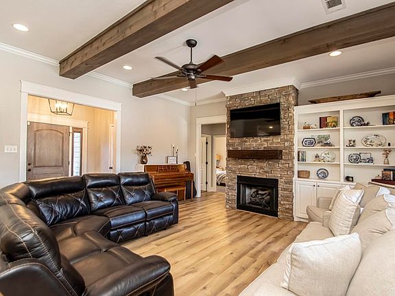 This custom-built home offers a perfect blend of country living on 4.49 acres of land. The landscape includes a serene creek, mature trees, and a meticulously designed pool area. The pool itself is a standout feature, boasting a custom lagoon style design. Surrounding the pool is oversized stamped concrete, providing ample space for lounging and entertaining. Bubblers in the pool enhance the relaxing atmosphere, and sunbathing. The pool is equipped with a tanning ledge, fountains, catering to different preferences. Beyond the pool is a 3-stall horse barn and shop with durable concrete flooring. For safety and peace of mind, an upright Safe Room is conveniently located in the garage. The interior of the house is thoughtfully designed, featuring 4 bedrooms that accommodates king size beds and a bonus room upstairs, providing ample space for a growing family or hosting guests. The 2.5 bathrooms include a master bath with oversized tile shower, double sinks, and a vanity sitting area. Mudroom with lockers for organized storage and a laundry room with hampers to simplify daily tasks. The backyard is fenced offering space for pets. Agents, please see agent remarks.