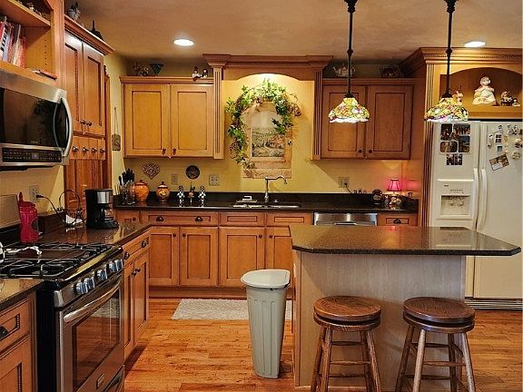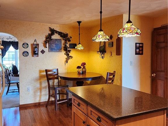 Move right into this beautifully maintained home. Walk in the front door to a nice entry with closet and make your way into the bright living room with a wood burning fireplace. Then head into the formal dining room, and into the gorgeous kitchen. An abundance of cabinets, kitchen island, room for a table and bar stools, and TONS of counter space. The kitchen is open to the family room with vaulted ceilings and sliding glass doors to the nice sized trex deck overlooking the back yard space. There is also a full bath on the first floor and the laundry room with pantry shelves! Upstairs you will find a large master bedroom and another full bath. There is a second bedroom, with a captive 3rd bedroom space that has windows and a closet. Or use the space as a play room, den, or office space. There is also ample storage in the basement. A nice private patio and shed in the backyard space. There is also an 1 car garage that has a door right into your kitchen!