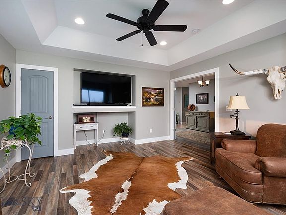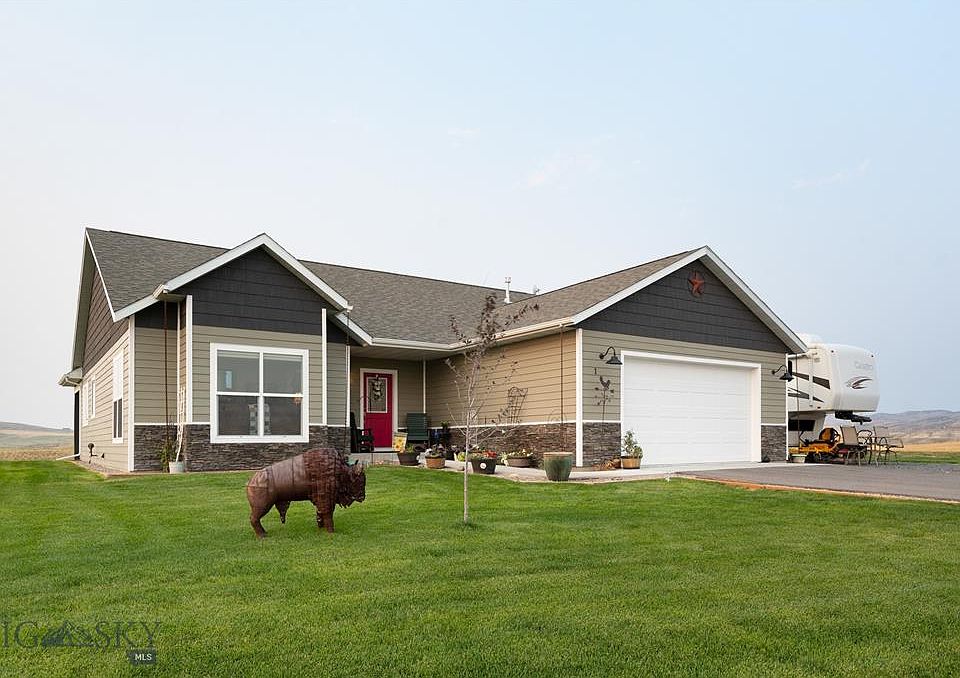 Are you looking for space around your home? This is a darling one-level home with views of rolling hills, farmland, and beautiful sunsets. It is an open yet warm, cozy floor plan. The sellers use the front bedroom as their Montana Room for watching TV. It is a great TV room, office or additional bedroom. The master is on the backside of the house with a soaking tub with a great view. There are trayed ceilings in the living room and master suite. The sellers installed a water softener, reverse osmosis, and underground sprinkler system. Watch the Montana sunsets from the back porch right off of the living area. There is a cute wagon in the back that will stay. There is a RV pad with water/power hookup right next to the house as well as a shed that conveys that is as big as a tiny house. 2021-10-22