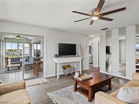 Watch the sunrise, passing boats, dolphins, and manatees from your large lanai. This beautiful 2nd floor condo is being offered partially furnished & over looks the gulf access canal with 1 bridge out to the Caloosahatchee River. This condo is in a 55+ community and just got all new boat docks, seawall, and irrigation, along with other property upgrades in the past year. New roof installed 2023. This condo also is equipped with electric hurricane shutters making it easy to secure your property while out of town or before a storm.Step inside and you will find a Spacious kitchen with plenty of countertop space. Brand new vanity countertops and faucets in both baths. Separate laundry room with extra storage. Boat docks are 1st come 1st serve basis. Centrally located with Publix grocery right across the street and just a short bike ride into downtown Cape Coral where you will find restaurants, entertainment, and much more. Property is on central water and sewer and assessments are Paid.