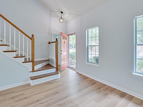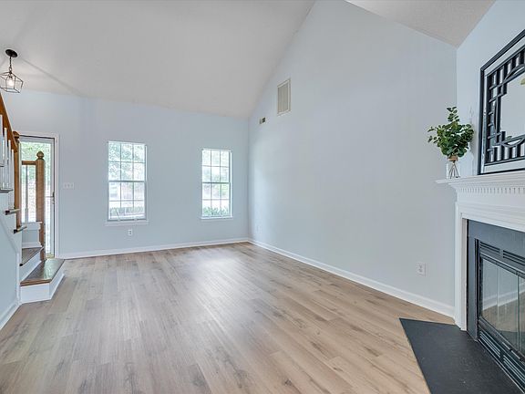 This cozy cape cod charmer has an upscale vibe with new light fixtures, new LVP throughout, fresh paint, defined spaces! Walk, bike, or roll to Wegmans, Lowes, restaurants, and more! Don't miss out on this 3 bedroom, 2.5 bath home in quiet Colony Lake. This home sits on a lake front lot, so you have the peace and serenity of water views from your backyard. The primary bedroom is on the main floor and has a walk-in closet, bathroom with tile floors, new toilet, furniture piece vanity cabinet with two sinks, and a tub/shower combo. The great room has a two-story ceiling, corner fireplace, and opens to the kitchen and dining area. There is a separate den for your home office or a great work-out space, you decide! Good closet storage. Sliding glass doors go out to the rear deck with great water views. Detached shed for storage. Ready to close and move right in. Busline access to Chapel Hill.