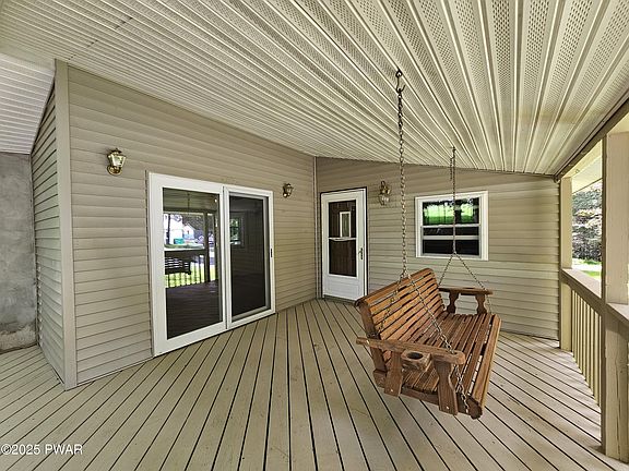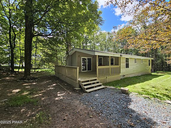 Charming & Affordable! This newly updated ranch style home offers comfortable single level living with extra space to grow! This property features two bedrooms, two full updated bathrooms, and a bonus room that can serve as a third bedroom, home office, or hobby space! The open and inviting floor plan features a bright living room with new windows and sliding glass doors, as well as a functional eat in kitchen with new stainless-steel appliances. Enjoy TONS of deck space for entertaining or relax on the covered porch swing. Nice flat level yard is a great spot for outdoor activities, and the large driveway offers plenty of space for parking! Spacious unfinished basement provides excellent storage and endless potential to customize. Conveniently located within walking distance to the community waterfall, pool, clubhouse, tennis courts and playground, and just a short drive to Lake Wallenpaupack, Promised Land State Park, I-84, dining, shopping and other Pocono attractions. Whether you are starting out, winding down, or just looking for that vacation escape, this home checks all the boxes.