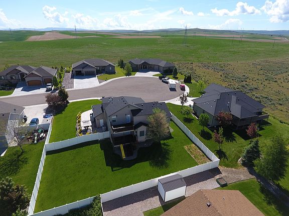 A MUST SEE! This spacious home has amazing views in every direction. From the either patio on the main level or master bedroom, the elevated view to the west overlooking the American Falls reservoir in the distant is spectacular and the evening sunsets can be spectacular. As you enter the home you are greeted to vaulted ceiling in the great room that is open to the staircase going up to the second level. The kitchen features include custom knotted cherry cabinetry with granite counter tops, high-end stainless-steel appliance which include a gas range/oven. The dining area and family room are open to the kitchen area. The second level includes a master suite which is completely insulated for sound, abundant natural light, his and hers walk in closets, custom shower, corner jetted tub, dual sinks and access to private deck. The entire home is wired for audio and video including garage and 7 channel surround system in family room. The home is heated and cooled by a high efficiency system with dual controls. The back yard is surround by a privacy vinyl fence.