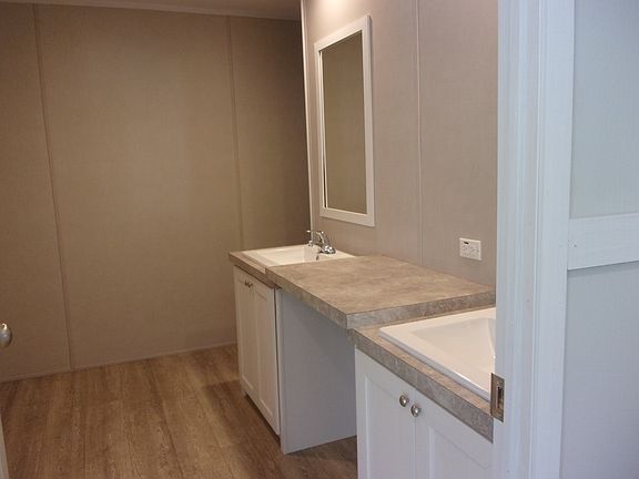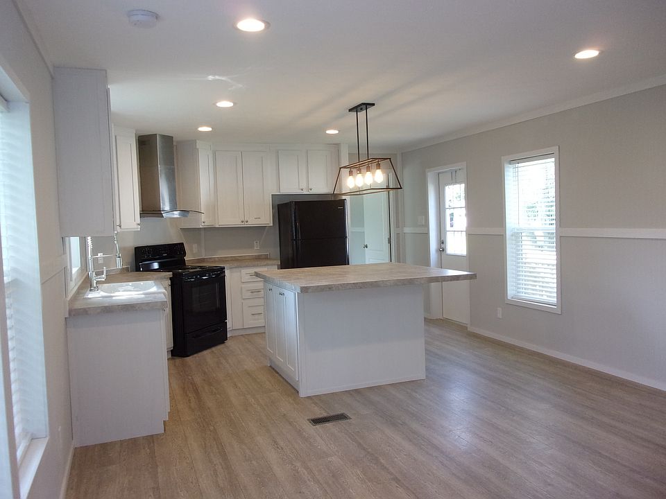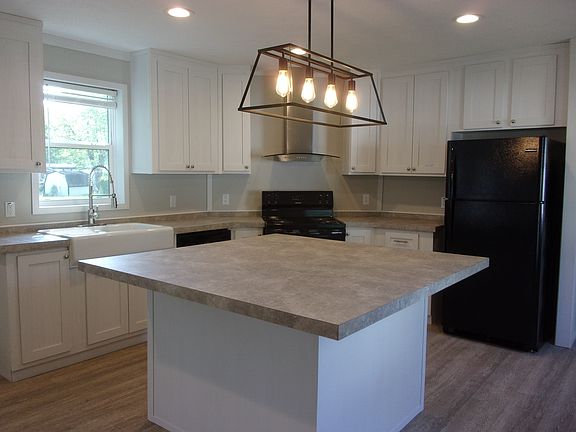 Modern, open design with a beautiful island and drywall upgrades. 16x76 without hitch3 Bedrooms2 BathroomsFarm House SinkPremium ChandelierGlass Range Hood6-Door Cabinets60" Walk-in ShowerKitchen Island with Bar SeatingDrywall with Contemporary TrimVinyl Flooring Throughout50 Gallon Electric Water HeaterGas FurnaceMini Blinds ThroughoutAir Conditioning 2.5 TonCustom Decks