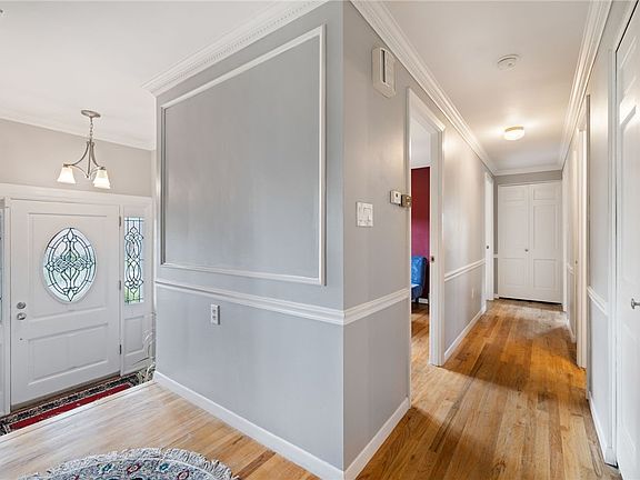 Charming brick ranch nestled on a spacious corner lot. Inviting entrance features beveled glass. Neutral tones, gleaming hardwood floors, crown molding, large bay window and a fireplace adorn the cozy living room, ideal for gatherings. Dining room boasts a modern chandelier and sliding door to the covered patio, seamlessly extending entertainment space outdoors. Well-appointed Eat in kitchen showcases stainless steel appliances. Updated hallway and master baths exude elegance. Three ample bedrooms, with the master boasting a wall of closets. Lower level offers a lovely finished family room with wet bar and powder room. Expansive laundry room with abundant storage. Garage includes built-in closets, eliminating the need for extra storage sheds. New Electric Box recently installed! Beautiful cement driveway and retaining wall enhance curb appeal. Conveniently located near shopping and within the Moon Area School District.