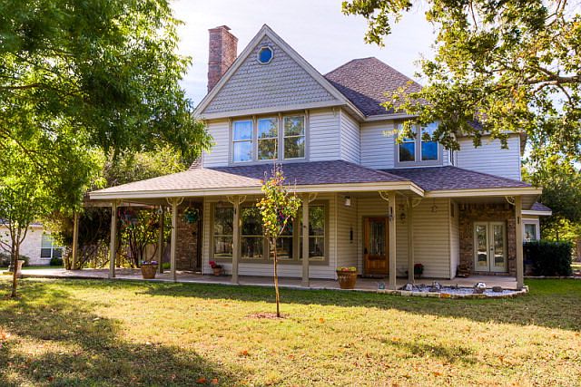 Lovely trees shading Wrap Around Porch on Victorian Style Home. Great room features fireplace with wood burning insert for cozy evenings. Open concept utilizing view to Kitchen and Dining area. Living room featuring high ceilings and light colors. New (10/17/2015)Front door with stained glass window. Some oak floors,vinyl, and carpet in Bedrooms. Two Bedrooms up. One Bedroom offers a loft area reached by an attached ladder. Wonderful for kids playhouse or extra storage.