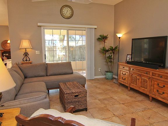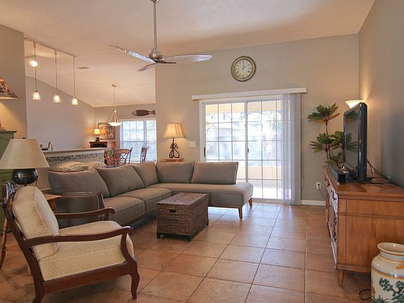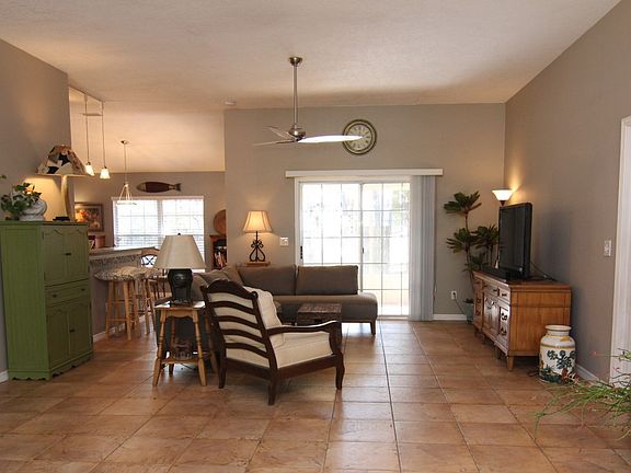100 x 100 lot Escape into this quiet, spacious, private oasis! This one of a kind tropical-themed home gives you a feeling of rest & relaxation.Dramatic cathedral ceilings in the master and main living area,& tile throughout create the feeling of wide open space.Enjoy your morning coffee right outside your bedroom's private entrance to the lanai.Master bath has garden tub & large shower.This home's extra large wooded lot, flowering fruit trees, & large screened lanai is a nature lover's paradise. new paver patio for all your sunbathing and gardening chores.