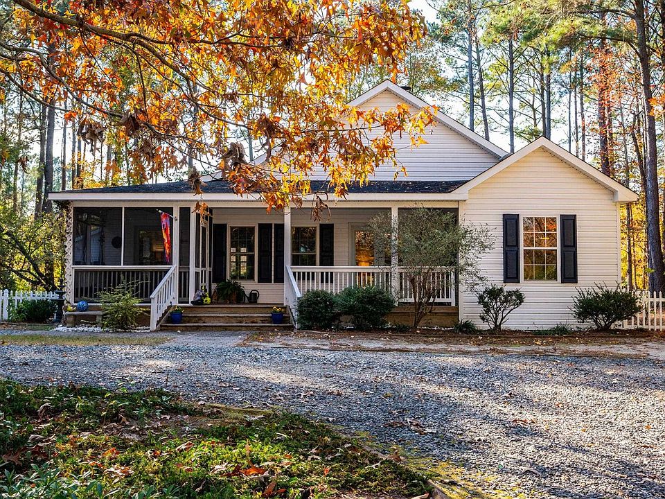 A place to call home! This adorable one-level living home has a wonderfully warm and inviting ambiance, reminiscent of the picturesque settings often featured in our favorite Hallmark movies. From the well-maintained exterior to the thoughtful interior details, every aspect of this property exudes a sense of comfort and character. A tree-lined circle driveway sets the tone for that quintessential "home sweet home" feeling. An idyllic open front porch and charming screened porch immediately draw you in; a delightful outdoor retreat that beckons you to soak in the serene surroundings offered from this spacious lot. From the quaint porch through the front door, you will find an immaculate cottage that has been lovingly cared for by the owners. Imagine curling up by the wood-burning fireplace on a chilly evening, or hosting a festive holiday gathering! We love the heated and conditioned sun porch that offers an additional cozy space for movies and a game night, or a perfect place for a book, or a well-deserved nap. The modern living room is pin perfect and flows into a super clean, tidy and functional kitchen. The kitchen's streamlined aesthetic continues into the adjacent, window-adorned dining space. The home offers three nicely-sized bedrooms and 2 full bathrooms. Hardwoods floors throughout that balance beautifully to the tiled bathrooms and tiled 2nd cozy living space on the converted sun porch. Double closets and en-suite bath in the main bedroom with another large bedroom, full bath and 3rd bedroom down the hall. The current owners love the pull-down access attic space that provides tons of extra storage! The outside is also an oasis- not be outdone by the adorable and pristine interior. Enjoy the patio off the sun-porch room, soak up some sunshine and fresh air. The outdoor shower is another fun and functional feature. In the cooler months, delight in the warmth of a fire and s'mores in the backyard firepit. The elevated workshop/shed is amazing; currently used as a workshop. Continue to use this space as a workshop or create the space of your dreams! With over a 30,000 sq lot, appreciate the peace of lower Currituck, while only being 2.4 miles from the Wright Memorial Bridge. Envision making wonderful memories in this amazing home and property!