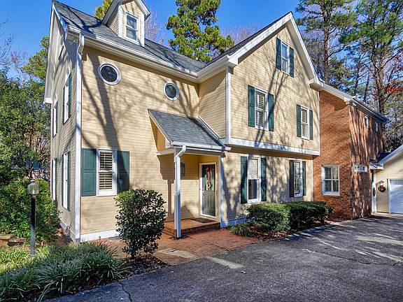 This is NOT a COOKIE CUTTER HOME! If you are looking for a unique opportunity in Cary, this lovely Wimbledon home is it. Come on home to this custom built, cul-de-sac house in a fabulous neighborhood in central Cary! Very private setting where you feel like you are at a lodge, but are in the middle of Cary. The minute you enter you immediately feel the coziness. The main floor is all hardwood, with a Living, Dining, Family, Kitchen and Great room. A stunning see through gas brick fireplace from Family Room to Great Room. Step down from Family room into the Great Room/Office area and enjoy the peaceful view. It's quite likely you may see a deer or two strolling by. Tons of windows to let in natural light. Step outside and enjoy a very private deck. Updated kitchen with a unique bar style eating area. Second floor offers a very spacious primary bedroom with 2 walk-in closets and a WOW bathroom. Don't miss a private relaxing 2nd floor deck you can access from your bedroom. Also on the 2nd floor are two additional bedrooms, a full bath and Laundry Room. 3rd floor boasts a bedroom suite complete with private bath and kitchenette! DO NOT MISS THE Oversized 2 car garage with a Bonus Room above (permitted). Exterior painted 2024, Roof 2017, Tankless hot water heater. HOA includes walking trails, recreation center; pool & tennis. All this with its privacy just minutes from dining & shopping including Trader Joes & Whole Foods. This is one you must see to appreciate!