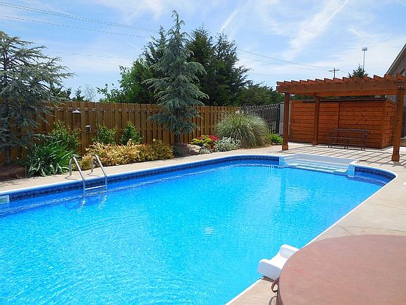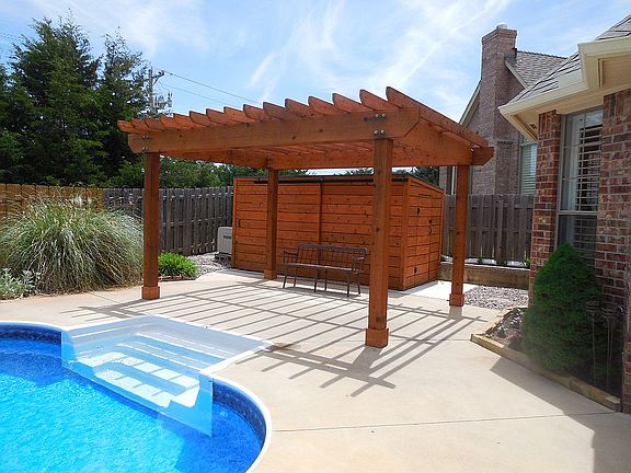 Gorgeous home in Coffee Creek! This beautiful home has new wood floors, an open floor plan that's perfect for entertaining, and a bonus room upstairs. The pool table can stay with the right offer! The large living room has a wonderful fireplace and is open to both a formal dining room and the kitchen. The kitchen has a great island, a gas range any chef will enjoy, granite counters, and a roomy informal dining space. The master suite is spacious, and the huge walk-in closet even has chandeliers! Two secondary bedrooms are joined by a jack-n-jill bath, and the 4th bedroom is currently being used as an office. The garage has an epoxy coating, and a STORM SHELTER! But just wait until you see the absolute paradise right in your backyard!! Enjoy the heated pool and hot tub, the pergola and equipment shed, the chaise lounges, the covered patio, outdoor kitchen, and a greenbelt for privacy. Just a short walk to the rec. center, basketball courts, and playground, this home has it all!