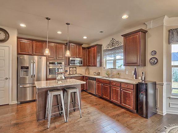 - RoomKitchenFeatures: Granite Counters, Kitchen Island, Pantry, Recessed Lighting, Eat-in Kitchen, Floors-Hardwood, Cabinets-Stained, Backsplash-Tiled