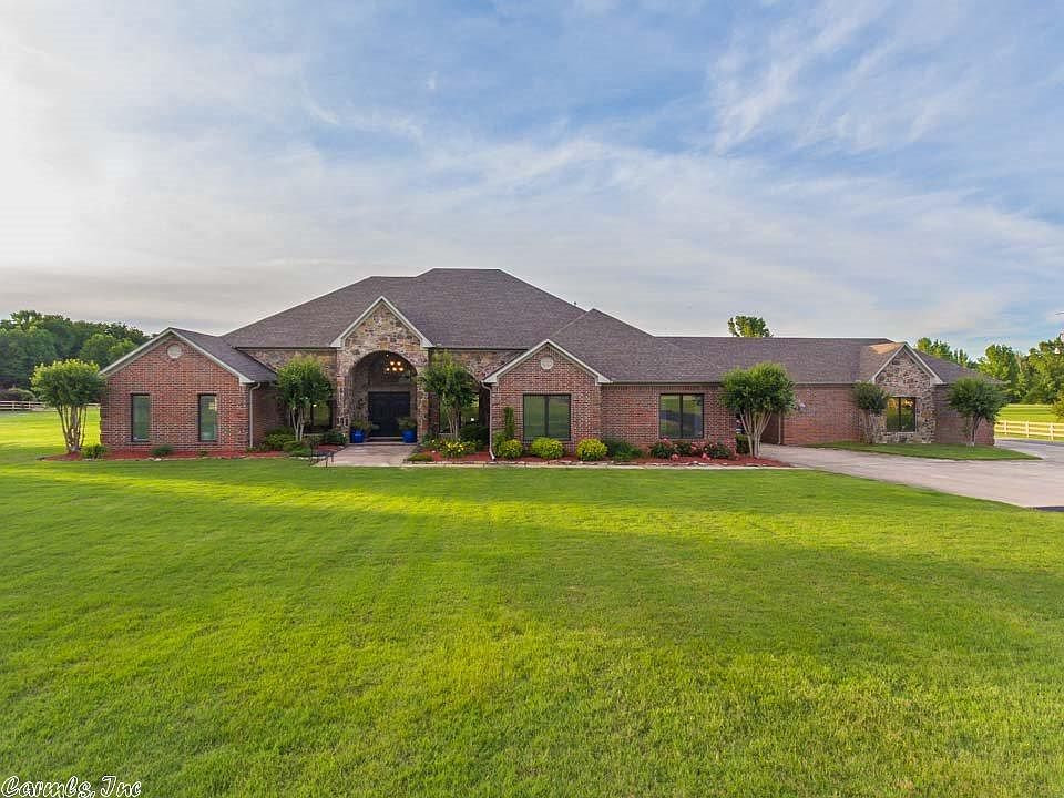 Stunning custom built gated estate on desirable Cadron Creek! Kitchen w/new granite countertops, ss appliances including Viking Range & Sub Zero Fridge. Meticulously well maintained single story home complete w/ 4 bedrooms plus study, theater room, and enclosed sunroom with custom site built fireplace overlooking the sprawling acreage including 2 Barns containing 3 car garage/shop, tack room, stables, and washing station w/built in drain. Enjoy the sunset from back patio, or hot tub! Priced Below Appraisal!