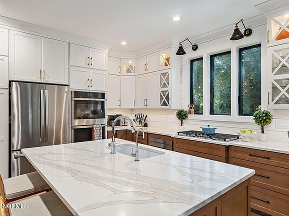 One of a kind custom built home in a one of a kind neighborhood. This house is the definition of coastal elegance. As you enter, the driveway is flanked by a canopy of majestic live oaks that lead to an inviting front porch. Inside you find an open concept living, dining and kitchen space with floor to ceiling shiplap, custom cabinets, quartz countertops, custom brick fireplace, stainless appliances with double oven, gourmet gas range, and a mesmerizing view of the outdoors. One of the best features of this house is the 12 foot Anderson sliding doors that lead to an outdoor entertaining space with custom brick fireplace and outdoor kitchen with slate countertop. An entertainers dream space!