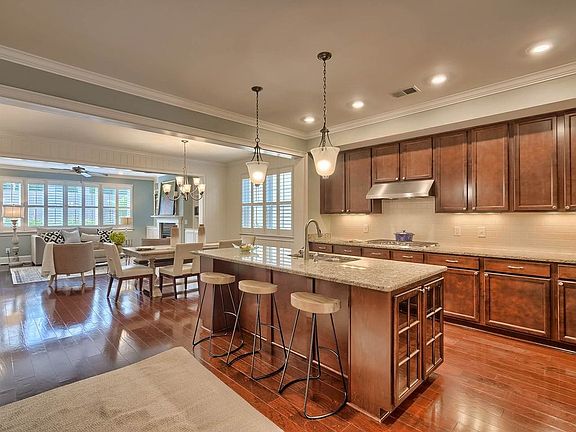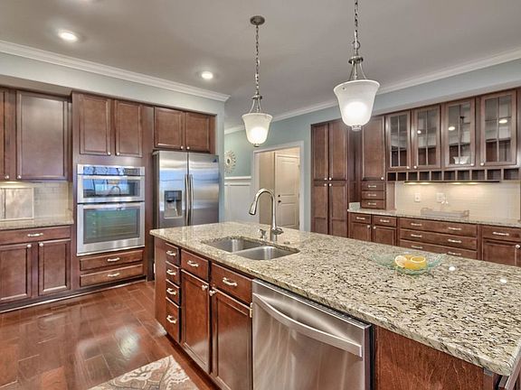 • RoomKitchenFeatures: Granite Counters, Kitchen Island, Recessed Lighting, Eat-in Kitchen, Floors-Hardwood, Cabinets-Stained, Backsplash-Tiled