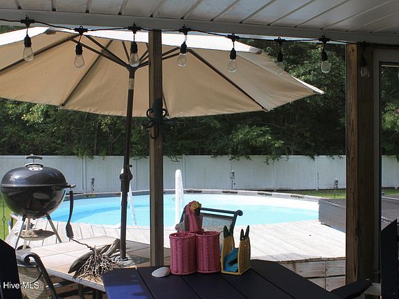 Great single family home with a large privacy fenced in back yard. This property comes with an above ground pool with deck for lounging, outbuilding, screened in back deck for relaxation and a covered front porch. The primary bath has been updated with a new tiled large shower and fixtures. This home comes with stainless steel appliances in the kitchen that were purchased in 2023. Freshly painted in the primary living areas along with the primary bedroom and bathroom. This property has access to the community park, playground and beach/sound access once you join the HOA. There is also a community boat launch and boat slips that are available for yearly rental.