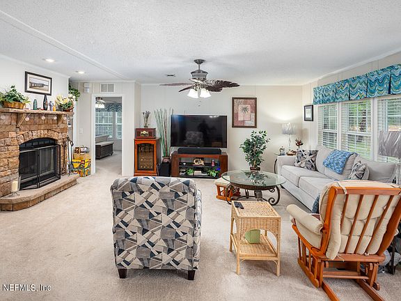 Step into this gorgeous, well-loved home on a nicely landscaped lot. Once you enter you will enjoy the large open living room that offers a wood-burning fireplace, new flooring throughout, and a separate dining room perfect for family dinners. There are lots of upgrades to the home including the HVAC system that is less than 3 years old, commercial grade water heater 2 years old, and new sinks and faucets in both baths and the kitchen. The outside offers a large covered patio alongside the screened porch, just steps away from a newly lined above ground pool. Home sits on a cement foundation, has covered concrete parking, a 2-car detached garage equipped with water, electricity and automatic garage door. There is also an irrigation system to make maintaining the lawn a breeze.