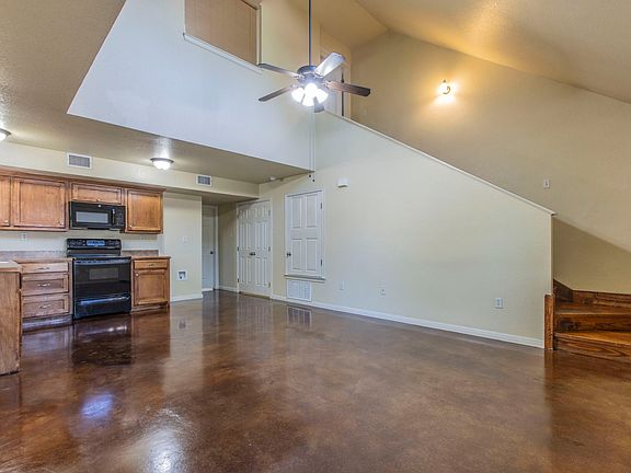 Approx. 960 sq. ft. of stylish living in a town-home style loft duplex plus a single car carport with an additional parking space. The town-home contains 1 large bedroom and bath downstairs and a large bedroom/bath area upstairs looking down over living area. There are ceiling fans in the bedrooms and den. The dishwasher, microwave, vent-a-hood and free standing range are provided along with a closet containing washer/dryer hookups inside the home. Refrigerator available to rent for $25 per month. Downstairs the floors are stained concrete, upstairs is wood flooring. Pets allowed with additional deposits.