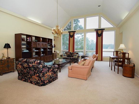 Beautiful wide lakefront views! This lovely brick and wood home was a builder's custom home and it shows in all the outstanding details. Located on one of the best lots on Lake Pinehurst, the property has great curb appeal with mature landscaping and many flowering bushes and plants. The interior is open with soaring ceilings and window walls that practically bring the view inside. The main level features a huge great room, separate dining room, a cozy den and a kitchen that opens to the hearth room with a fireplace. The master suite is also on the main level and there are two bedrooms, bath and another family room with kitchen facilities on the lower level. Great space for the whole family and a perfect place to just enjoy living!