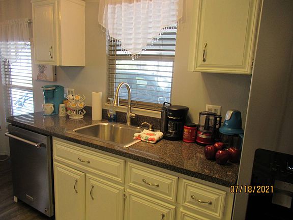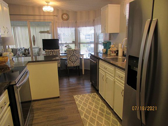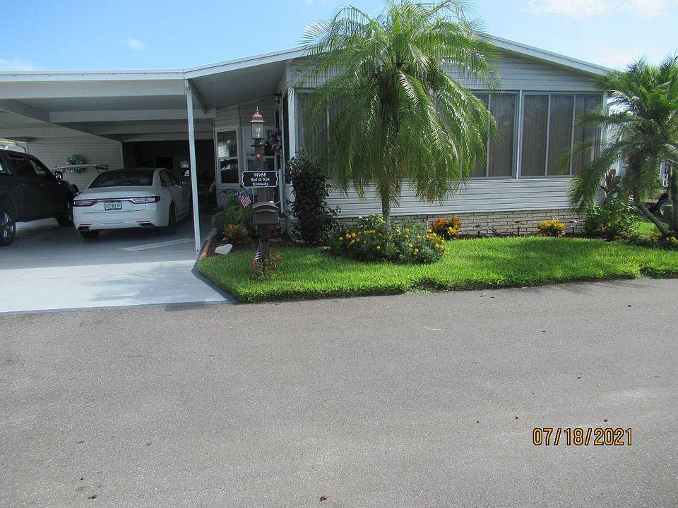 2bedroom/2bathroom (1568 sq.ft.) $75,000 Gorgeous updated home comes with a large living room and a huge wall shelving unit, sliding glass door that opens all the way into the wall going into the beautiful large sunroom complete with shades, screens air and heat with remote control new ceiling fan. The eat in kitchen with sliding glass door has all new appliances, Samsung range with air fryer, large pantry and tons of cabinets, stunning dinning room all furniture stays. The master bedroom is very spacious with an attached master suite with a walk in shower and California closet organizer in the walk in closet. The guest bedroom has a walk in closet as well . In addition, there is a small office/mudroom with a coat closet huge laundry room with a sink and tons of storage. Also, there is a hobby room or workshop room, large double carport with tons of room for patio and grilling. Views of the water feature at the south gate near the pond, all new window treatments, shades and rods, new kitchen faucet, new flooring in kitchen and mud room. Central air and heat all serviced by Watts and in good working state. Roof, and windows are in great shape. Comes with a golf cart that has four new tires. Beautiful yard and landscape. Lots of upgrades have been done including a new washer and dryer. Come see this wonderful, well appointed home.