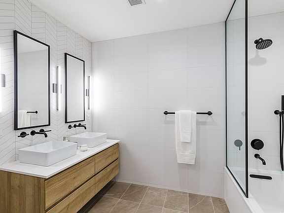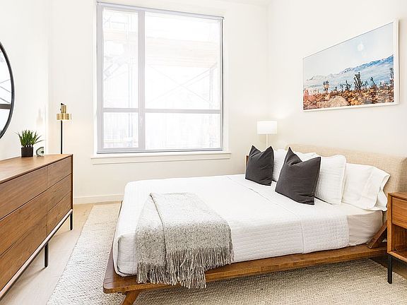 Residence 2G at 1080 Lorimer is a dynamic two bedroom home, outfitted with all the necessary details you have come to expect in new development. Upon entering you will feel the grandeur of this home with its massive, open u-shaped kitchen and living/dining room with oversized windows and high ceilings. Here the clean and elegant kitchen design is draped in marble and custom millwork, featuring a fully integrated appliance package by Bosch with noteworthy details such as Hansgrohe matte black fixtures and Pablo pendant lighting. This unique layout offers two sizable bedrooms and closets and bathroom which matches the beauty of the well intentioned interior design with bright tile, matte black fixtures and a custom vanity.