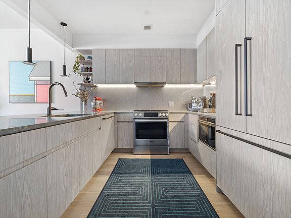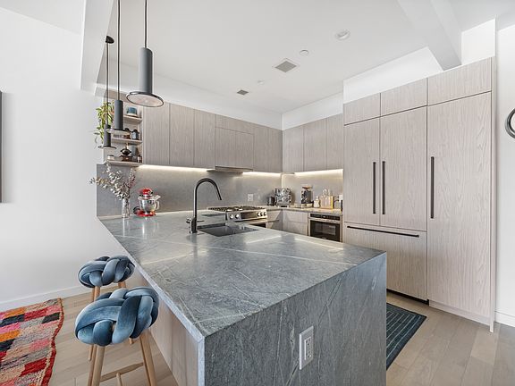 Sprawling 2 Bedroom & 2 Bathroom with soaring 10' ceilings and nearly 1200 sqft of Living Space.. Wide windows with northern exposure provide steady and consistent illumination to the interiors. Beautiful 5-inch European oak floors complement the high ceilings, gallery-style walls, and double-paned thermally-broken steel casement windows. Kitchen is equipped with gray marble waterfall peninsula, custom cabinets with matte black pulls, Cambria countertops and backsplash, PABLO pendant lighting, Hansgrohe fixtures, and a suite of fully integrated Bosch appliances. Primary Bedroom has a Walk-In Closet and en-suite Bathroom with a custom double vanity, a chevron tile accent wall, and a walk-in rain shower. Second Bedroom has a reach-in closet and easy access to another full Bathroom. Bathrooms have porcelain tiles, Kraus sinks, Lightology lighting, Robern medicine cabinets, Waterworks fixtures, and Toto toilets. Laundry closet with a Bosch washer/dryer completes the home. Amenities in the Building -- Virtual Doorman System, Package Room, Bicycle Room, Fitness Center, Private Lounge, and landscaped Courtyard with several seating areas and a grilling station. 1080 Lorimer is a former savings bank designed by Helmle & Huberty in 1906, located at the intersection of Cayler Street, Lorimer Street, and Manhattan Avenue. The building retains its imposing neoclassical facade and shingled dome while offering 29 modern homes and thoughtful amenities. It is moments from dozens of trendy restaurants, bars, cafes, and shops, and it is close to McCarren Park, Williamsburg, Bushwick Inlet Park, and Marsha P. Johnson State Park. Public transportation options include the G subway line and the NYC Ferry. No Pets - Unfurnished - Quick & Easy Approval Process!