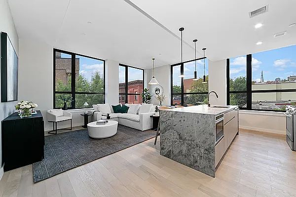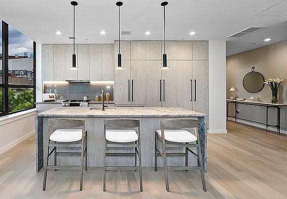 Luxurious LOFT-like living in the heart of Greenpoint. Welcome to 1080 Lorimer, the perfect blend of old and new architecture set against the vibrant neighborhood of Greenpoint. With soaring 10' ceilings and large gracious layouts, each unique home gives off a feeling of grandeur and sophistication. This brand new 3-bedroom, 2-bathroom home with 845sqft PRIVATE TERRACE has southern exposure throughout which highlights the airy interiors. Beautiful 5-inch-wide European oak floors complement high ceilings, gallery-style walls, and double-paned thermally-broken steel casement windows. Create your own outdoor oasis on the oversized terrace which flows from both living room and primary bedroom. An open-concept living room, dining room, and kitchen maximizes space and natural light. The kitchen is equipped with an eat-in Atlantic gray marble waterfall island, Cambria countertops and backsplash, custom cabinets with matte black pulls, PABLO pendant lighting, Hansgrohe fixtures, and a suite of fully integrated Bosch appliances. The primary suite has direct access to the terrace and boasts a walk-in closet and a pristine en-suite bathroom with a custom double vanity, a chevron tile accent wall, and a walk-in rain shower. The second and third bedrooms have walk-in closets and easy access to another full bathroom. Both bathrooms have porcelain tiles, Kraus sinks, Lightology lighting, Robern medicine cabinets, Waterworks fixtures, and Toto toilets. A laundry closet with a Bosch washer/dryer completes the home. 1080 Lorimer is a former savings bank designed by Helmle & Huberty in 1906. The building retains its imposing neoclassical façade and shingled dome while offering 29 incredible homes, and thoughtful amenities. It is moments from dozens of trendy restaurants, bars, cafes, and shops, and it is close to McCarren Park, Williamsburg, Bushwick Inlet Park, and Marsha P. Johnson State Park. Amenities include a fitness center, private lounge, virtual doorman system, package room, bicycle room, and landscaped courtyard with several seating areas and a grilling station. Public transportation options include the NYC Ferry and the G subway line. Private storage is subject to availability and fees. Pets are welcome. All measurements are approximate and subject to normal construction variances and tolerances and may vary from floor to floor. Sponsor reserves the right to make changes in accordance with the terms of the offering plan. The complete offering terms are in an offering plan available from Sponsor. File No. CD19-0223. Sponsors: 807 Manhattan Avenue LLC. Located at 38 East 29th Street-9th Floor New York, NY 10016. Exclusive Sales and Marketing by SERHANT. New Development. Equal Housing Opportunity.