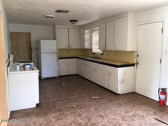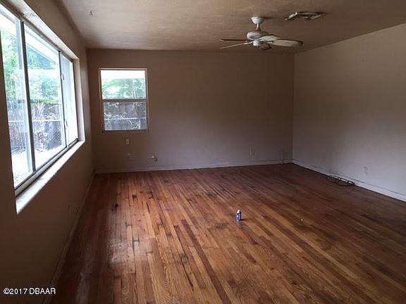 Fantastic Rambler style home in Daytona Beach! All block construction, with 3 bedrooms, 1 bath, large Kitchen and Living rooms, and a one car garage. This home has the original hardwood floors throughout most rooms, with new tile in the Kitchen and Bath. It's located next to a walking park with a great water feature, which can be seen from the Back Yard and Bedroom windows. The Back yard is very deep, and has ample space to add a pool or workshop. And the Roof and HVAC are only a few years old.