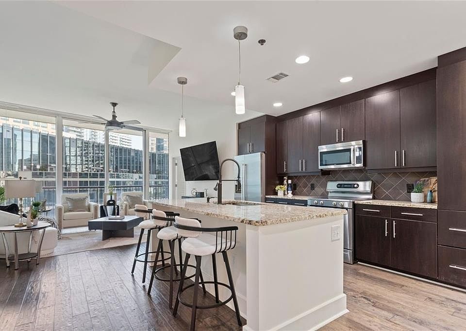 Exceptional Value at 1010 Midtown! Prime Location & Modern Finishes. Now available in one of Midtown’s most desirable high-rises, this well appointed 2-bedroom, 2-bathroom residence offers a spacious 1,213 sq ft of open-concept living. Located at 1010 Midtown, this unit features a split bedroom layout with a central living/dining area, ideal for both everyday living and entertaining. The well-designed floor plan includes a private primary suite with an en-suite bath and walk in closet, along with a secondary bedroom and full guest bath. This is currently the most competitively priced 2/2 unit in the building!  The unit features 10-foot ceilings, hardwood floors, and expansive floor-to-ceiling windows that provide excellent natural light and impressive views of the Midtown skyline. The open living and dining area flows into a sleek kitchen with stainless steel appliances, granite countertops, and ample cabinet space. Step out onto your private balcony for a front-row seat to the energy of Peachtree Street—a perfect spot to relax or entertain.  Walkable, Connected Midtown Living and Located on the Midtown Mile, this condo puts the best of Atlanta at your doorstep.   Walk to Whole Foods, Cafe Intermezzo, Publix, Piedmont Park, High Museum, Atlanta Botanical Garden, and the Fox Theatre, and a plethora of other entertainment and dining options. MARTA Station for easy access across the city. With direct access to I-75/85, commuting and travel is fast and efficient.   1010 Midtown offers an extensive lineup of resident amenities, including Rooftop Sky Park and heated saltwater pool with cabanas, Modern fitness center, media room, and resident lounge, Outdoor grilling area and landscaped gathering spaces, 24-hour concierge, controlled building access, and secure front desk service. The building also features on-site dining and retail, including Panera Bread, Sugar Factory, Crescent City Kitchen, Wicked Wolf, Ri Ra Irish Pub, and more—just an elevator ride away. Additional Features: Two assigned parking spaces (#630 and #631 on the 7th floor), Pool and Skydeck located steps from the unit on the 8th floor, Gym and community lounge located on the 4th floor. Garage access via Crescent Avenue; short-term parking available across from Bulla and Sam’s of San Francisco. Speak to concierge before exiting garage to avoid temporary parking fees. Well-managed HOA with over $1.8 million in reserves
