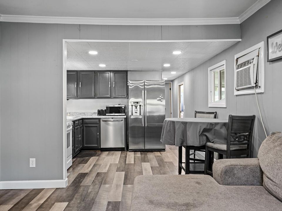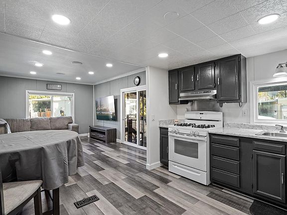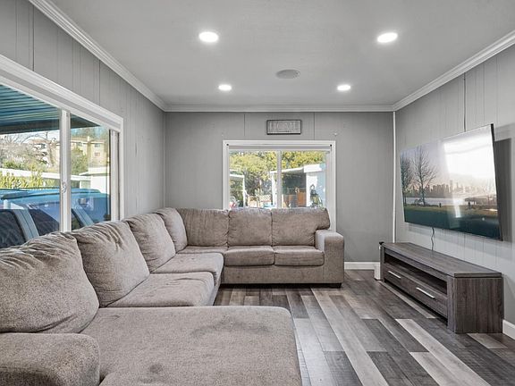 Welcome home to Sunny Acres all age park! This modern 1 bed, 1 bath home features an open floor plan with recessed lighting throughout, laminate flooring, and crown molding. Enjoy the versatility of the bathroom with a stand-up shower tub, and beautiful vanity. Relax in your very own backyard oasis with turf and hot tub.
