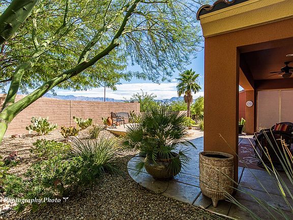 This stunning 1,571/SF Sun City Laurel has it all... LOCATION, UPGRADES, SETTING, AWESOME VIEW AND EXCEPTIONAL FURNITURE. This gorgeous home is located in Water Barrel, a desirable neighborhood in Del Webb's active adult community. Situated on a spacious lot, this desert retreat offers both privacy and an exceptional view of the eastern mountains. The orientation is ideal for year round outdoor use. The back yard has been beautifully landscaped and the stamped and stained covered patio has been extended out and elevated providing the perfect area to entertain and take in the scenery. The home is tastefully appointed with extended tile, granite counter tops, stainless appliances and upgraded cabinets. The paint tones are warm and the ceiling fans and window treatments are costly. The carpet in the bedrooms is brand new and the home is in excellent condition. The floor plan is open and the glass storm door and numerous windows provide a lot of natural light. The den/office is tucked away and the bedrooms are on opposite sides of the home. This immaculate home is being offered FULLY FURNISHED with all accessories and wall hangings. No expense was spared. You will not have to do a thin
