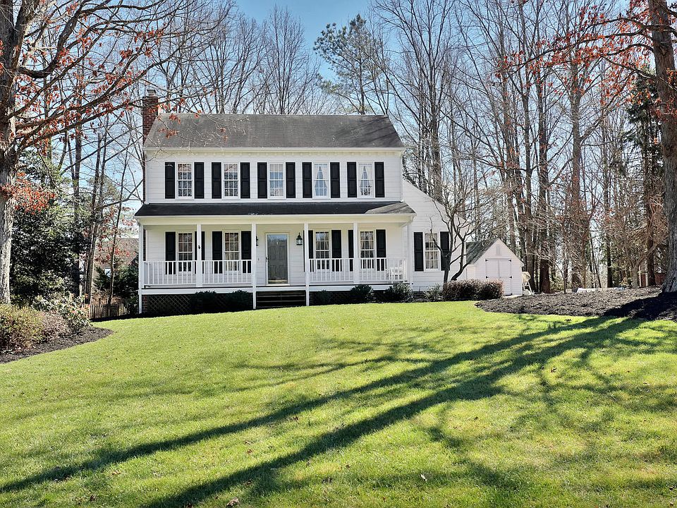 A long country porch welcomes you to this well maintained Colonial. Beautiful front lawn lined with Blue Bee cider apple trees, sited on elevated lot. Renovated kitchen, gray wood cabinets, granite countertops, all stainless appliances plus a versatile roll-away "hidden" island. Three bedrooms, two and a half baths, the master bath was fully renovated in 2019 - ceramic tile floor, tiled walk-in shower, custom vanity. Fully fenced yard, oversized decking great for entertaining. Newer water heater, updated heat pump, large workshop/shed with electric, wood-burning fireplace. Quiet cul de sac, minutes to deep Run Park, West Broad Village, shopping, restaurants.