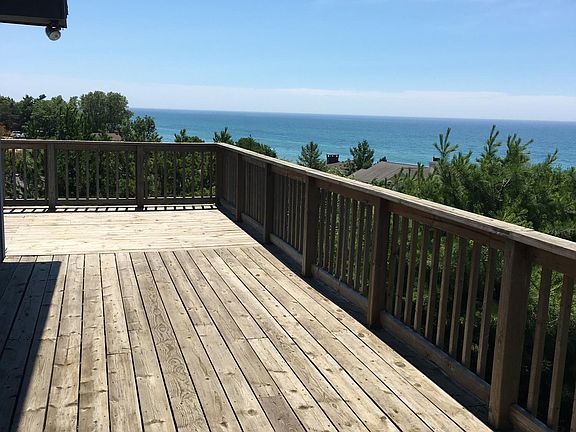 Million dollar views! Make your lake home dreams a reality with 1,500ft deeded access to Lake Michigan! Open concept kitchen, dining, and living room with expansive lake views. Large deck on 3 sides of the home plus a secluded side deck. A wood burning fireplace is perfect for fall and winter evenings to cozy up and watch the lake. Home has vacation rental history and agent is the current manager. Earn an investment back on your vacation property!