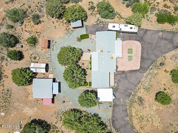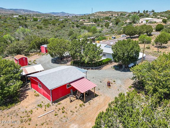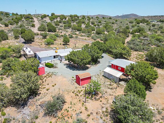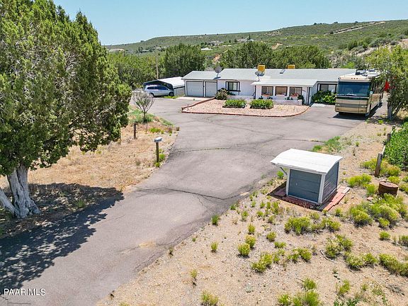 Quiet and peaceful 17+ acres of horse property in Mayer! This 3 bedroom 2 bathroom 1248 square foot home is just waiting for your personal touches. Split bedroom plan. New roof in 2017, new water heater in 2023, 2 screened in AZ rooms, 2 evap coolers, 2 room a/c units. Two car attached garage and 2 car detached garage with 3 carports and 2 sheds with electricity, owned propane tank, electric gate, water softener. City water. Seasonal creek flows through the back of the property. Small fenced back yard. Many mature trees with natural landscape. This property could possibly be split to sell off a portion or possibly be for generational living. Close to highway 69 and paved all the way. Easy access to Phoenix, Prescott and the Verde Valley. Don't miss out on this fantastic opportunity!