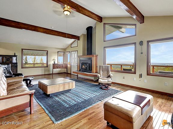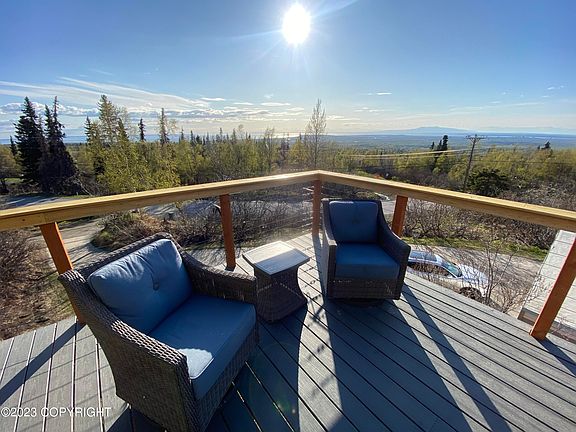 The achingly beautiful views will knock your socks off... and just minutes to multiple trailheads in the Chugach State Park. Stunning large chefs kitchen, living room with walls of windows and deck big enough to hold a party. Perfect escape to master bedroom (upper level) and spa-like bathroom with double shower heads, soaking tub with views and walk-in closet. Lower level with 3 bedrooms, bath,family room and laundry. Detached garage,Fenced dog/run area, New septic '20, metal roof, metal siding-easy maintenance.