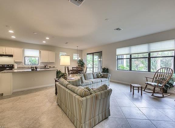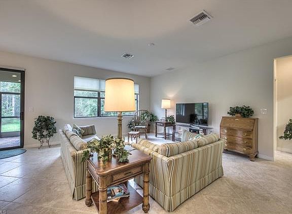 Great opportunity for this 2 bedroom + den Abbeyville model home with exceptional upgrades including hurricane impact glass throughout. The kitchen offers upgraded 42" cabinets with roll out drawers, granite countertops, extra outlets and more. The popular Abbeyville floorplan offers an ideal great room floor plan with kitchen open to large great room and expanded covered lanai. The spacious master suite has a large master bathroom with dual vanities, walk-in shower and spacious closet. The lot offers unique privacy with a preserve view and a home only on one side. You will love the wonderful garden view from the kitchen sink and den windows. The tasteful décor and expensive upgrades make this home an incredible value! Bridgetown offers impressive amenities include resort style pool and spa, fitness center, outdoor bar, bocce ball courts, tennis courts, catering kitchen, amenity center with multi-purpose room and much more.
