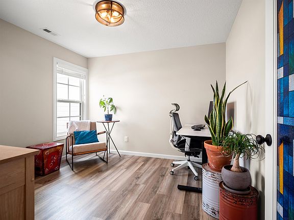 Picturesque views from the wall of windows in this inviting contemporary ranch with floor plan that is perfect for entertaining and smart for everyday living. Loaded with upgrades and better than new, this open but separate design offers a chef's deluxe kitchen with quartz countertops, gas range, walk-in pantry, and space for your coffee or wine bar. Quality vinyl plank flooring throughout the main living areas. Energy efficient HVAC system. Owner's ensuite with step-in tile shower and quartz countertops. Be sure to note there are 3 bedrooms PLUS a main floor office off the foyer, perfect for work or school from home. Also note the open sunroom or living area adjacent to the large dining area. Truly a great floor plan for all generations. The back windows have been professionally tinted in 2021 for UV protection. Enjoy the final days of summer at the association pool. Peaceful living yet easy access to everywhere.