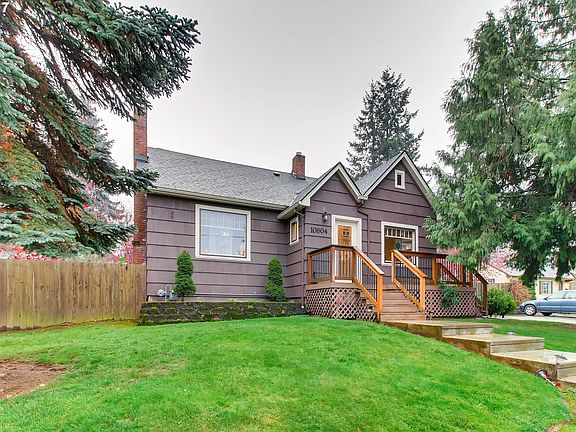 Darling bungalow on corner lot in the heart of Parkrose! Large, private backyard with deck, covered hot tub, garden bed and fruit trees. Two large bedrooms + full bath upstairs and one bedroom/one den + full bath on main. Large living room with fireplace and built-ins, dining room and updated kitchen with sunroom/nook. Newer roof, furnace, plumbing + more!