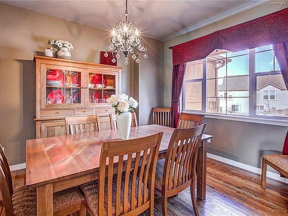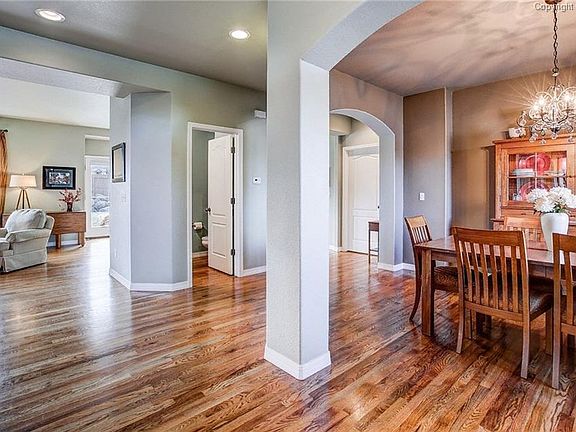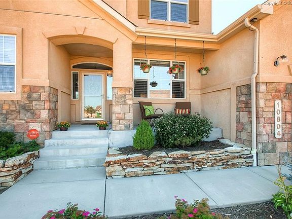 Enter this stunning two-story and be amazed at the craftsmanship! Bright and open floor plan on the main level! Office located off the entryway featuring French Doors. Elegant Dining Room w/ arches accenting the entrance! Great Room features a gas fireplace w/ mantle. Spacious Kitchen w/ stainless steel appliances, tile backsplash, maple cabinets, and an adjoining Eating Space Nook. Large Backyard offers a large patio, custom Pizza Oven, and Pikes Peak Views! Fully finished Basement w/ Wet Bar, Family Room & Game Area! Upper level features four additional bedrooms with a Jack & Jill Bathroom adjoining two of the Bedrooms. Gorgeous Master Bedroom w/ vaulted ceiling and adjoining 5 Piece Bath! Air Conditioning, Storage, close to Schools, & More!
