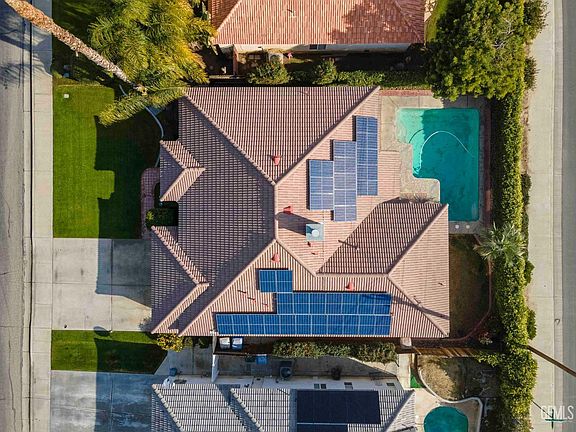 Southwest Bakersfield home with OWNED SOLAR and a POOL! 4 bedroom, 2 bathroom home features tile flooring in the main living areas and hardwood flooring in all bedrooms. Floorplan includes formal living and dining area in the entry and a kitchen that is open to the family room with built-in entertainment center and fireplace overlooking the backyard and pool. The kitchen provides ample storage, an island, and a breakfast nook. The primary suite has a walk-in closet, great views of the pool and direct access to the backyard. Primary bathroom features separate soaker tub and shower. The property has been recently upgraded with newer HVAC system, pool pump, and water heater. Conveniently located in the Stockdale High School district, this home is ready for a quick close.