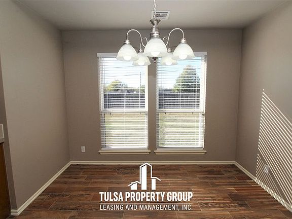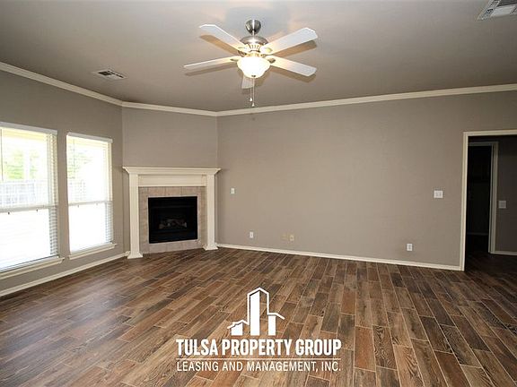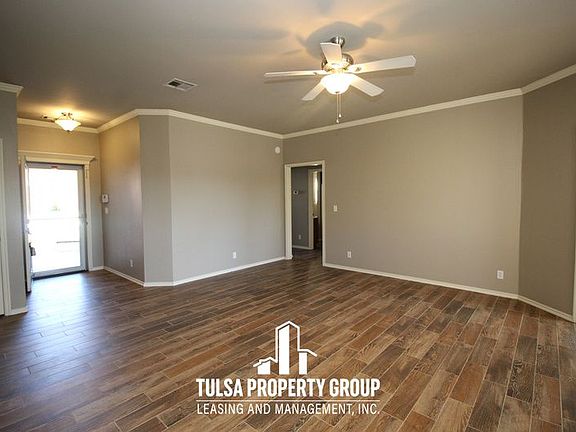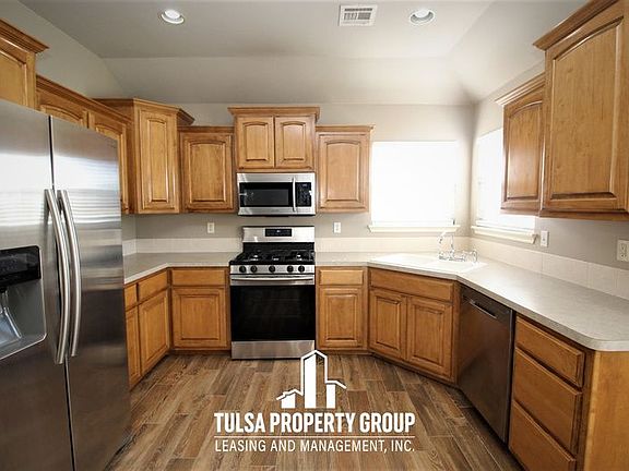 Beautiful home in Owasso schools!Four bedroom- Two bath- Two car garage- Split floor plan- Large living room- Fully equipped kitchen with stainless steel range, oven, dishwasher, microwave, and refrigerator- Spacious master suite has his and hers closets, jetted tub, walk-in shower, and dual sinks- Covered back patio- Storm shelter- Fully fenced backyard