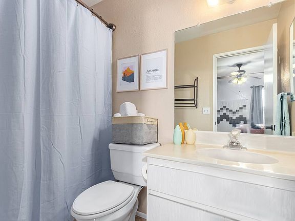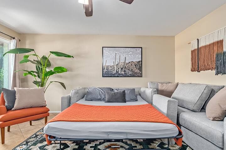 Located only 7 minutes from both State-Farm Stadium and Desert Diamond Arena, the stadium condo is ready to host you and your guests for the next big event! Situated near the West Gate Entertainment District the condo has quick access to Top Golf, Desert Diamond Casino, the soon-to-be "VAI Resort" and so much more. Featuring mid-century modern furnishings and accessorized with south-western decor, you'll feel immersed in the beauty of the 48th state. The condo has been carefully designed to make you feel at home. It is prepared with a stocked kitchen, in-unit laundry, and enough blankets/linens to build a fort! The condo has 3 outdoor spaces to enjoy your morning coffee, your afternoon tea, or your evening margaritas. A large sectional in the living room with a 65' flat screen smart tv can be the center for your movie nights after a day exploring Glendale. Renter pays for all utilities, Security Deposit due upon lease signing. Renter pays 1st month's rent and sales tax at move in. 1st pet $300 non refundable fee, 2nd pet $250 refundable deposit. Pet rent is $25 per month per pet. HOA has breed/size restrictions on dogs.