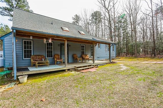 Available Now! Enchanted cape cod situated on two lots for a combined total of 4.46 acres in Prince George County. Circular driveway allows for plenty of parking and easy access to the porch and front door. Enter into the remarkable family room boasting a cathedral beamed ceiling, plush carpeting, skylights, one-of-a-kind designed wood staircase and open to the kitchen creating a great entertaining atmosphere. Kitchen includes an island with overhang for a couple of stools, ceramic tile flooring, and access door to the rear deck. Large dining room off the kitchen has beautiful laminate wood floors that flow into the spacious master bedroom. Master bedroom comprises of a private bathroom with a shower and window for added natural light. Upstairs room has a few possibilities, with the half bath it could be an office, play room, den or potentially a 4th bedroom. The oversized porch is great to enjoy nature and the warm weather. Highlights include: 2 tankless water heaters, ceilings fans, lots of cabinets and countertop space, vinyl windows, 2 storage sheds, carport, wooded lot, and located close to interstates, schools and shopping conveniences. Qualifies for USDA 100% financing!