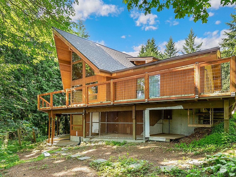 Great opportunity to have it all! This genuine PNW beauty is nestled in on a near 5 acre serene wooded property. Gorgeous design featuring high vaulted open beam ceilings and slate flooring. Main level is vast & features open living spaces. Enjoy the breathtaking forest & wildlife views from the massive A-frame style windows or out on the spacious new deck! Upper level loft primary bedroom with private bath. Bonus works space on lower level. New roof and great location! Book a tour today!