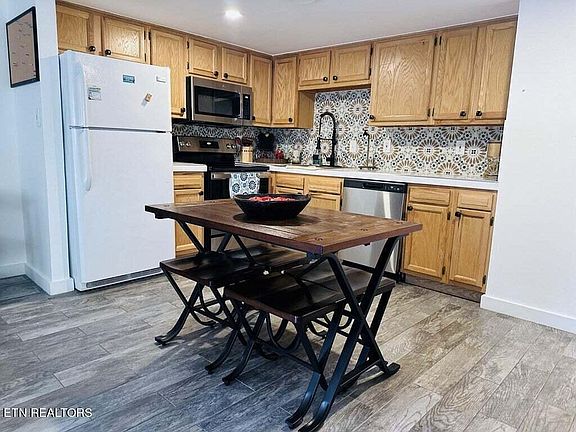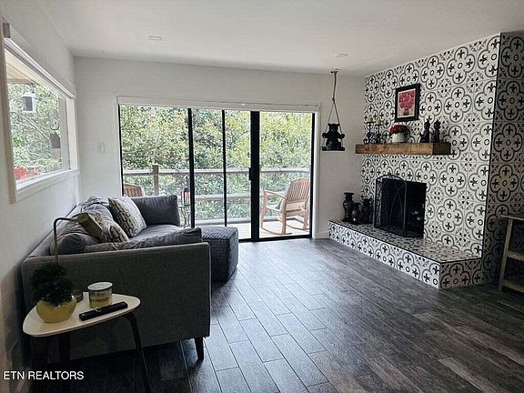 Exquisite 1BA/1BA corner unit Condo is nestled in the heart of the Smokies! This charming residence, located in the sought-after English Mountain Condos Community, presents an ideal haven for your serene vacation retreat or lucrative investment venture. Revel in the allure of porcelain wood tile flooring throughout, complementing the open concept kitchen/living room bathed in natural light from elegant sliding glass doors leading to a covered back deck. Complete with motorized light filtering shades. Living area features a recently updated tile wood burning fireplace and queen sized sofa sleeper. The updated kitchen boasts lite colored cabinets and a tastefully tiled backsplash.