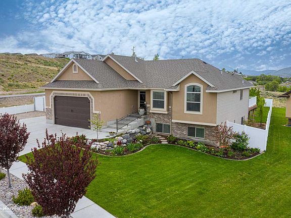 6 bedroom, 3 bathroom, Gas forced air and central air, Down stairs family room wired for home theater, Built- in sound system upstairs, outside and garage, Sprinkler system, full fence, R.O System and water softener, all appliances stay, Oversize garage 1058 sq ft finished textured and painted with tons of heavy duty built in shelves heated garage with 11 ft ceiling and fans installed. Double car garage is door is 9ft and third bay door is 10 ft. Third bay length is 36ft long, RV parking on the east side of garage wired with 30 amp service, 9 young fruit bearing age fruit trees, raised veg, beds. 10x10 storage shed. And a very nice trex deck to enjoy the evenings. Tile Bathrooms, Tile floors, Granite counter in the kitchen and bathrooms,