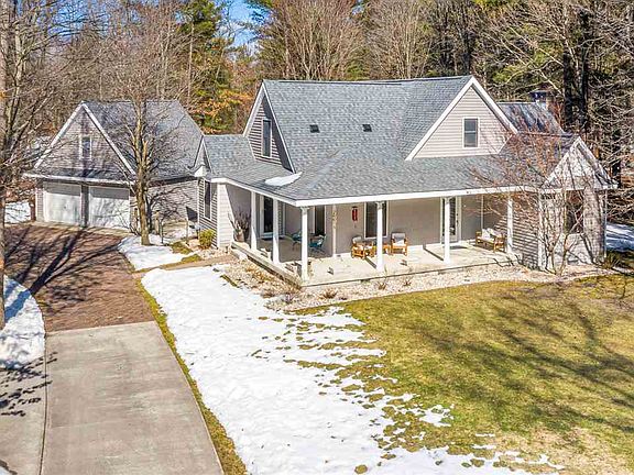 Nestled on 4.50 wooded acres, this updated home is as good as it gets. Paved circle driveway, three sides of the home have covered porches. Beautiful oak hardwood flooring throughout main floor areas. The kitchen has new quartz countertops. All bathrooms have been renovated. Other improvements include a new furnace, roof, and gutters. The great room has a 13 ft. trayed ceiling, hardwood flooring and is accented with a natural fireplace. Off the great room is an office area with glass doors for privacy. Main floor primary suite, with walk-in closet, large double vanity, and shower. The garage is heated with a loft large enough to be finish for extra room. This property is not one that you'll want to miss.