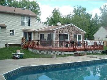 Lovely setting!Kitchen upgraded (2006)w/granite countertops, center island with sink,tle floors. All floors t/o the house are laminate or tiled in baths & sunroom. Vaulted, tung-in-groove ceilings with recessed or track lighting in the family room & 3 season sunroom. F/R - Great room, has a wood burning f/pl,skylights. The sunroom has floor/ceiling panarama sliding glass doors, so view of the deck and yard is plentiful. Sliding doors from the kitchen & sunroom lead you to a 10' wide wrap-around deck, giving access to the 36' x 18 inground pool! This pool, with newer liner(2009),a D.E. filter, & 2.5' x 8' depth, a real family house here.Lots of storage in the 17' x 17' pole barn, and work shop stays! Even with the pool, there's still lots of room for outdoor activities. The hot tub in the sunroom is included. The basement has a complete French drain system newly installed 2/2012. The grounds are lovely, with a fishpond and wooded secluded area. Home is being sold "As Is". Buyer responsible for all certs.