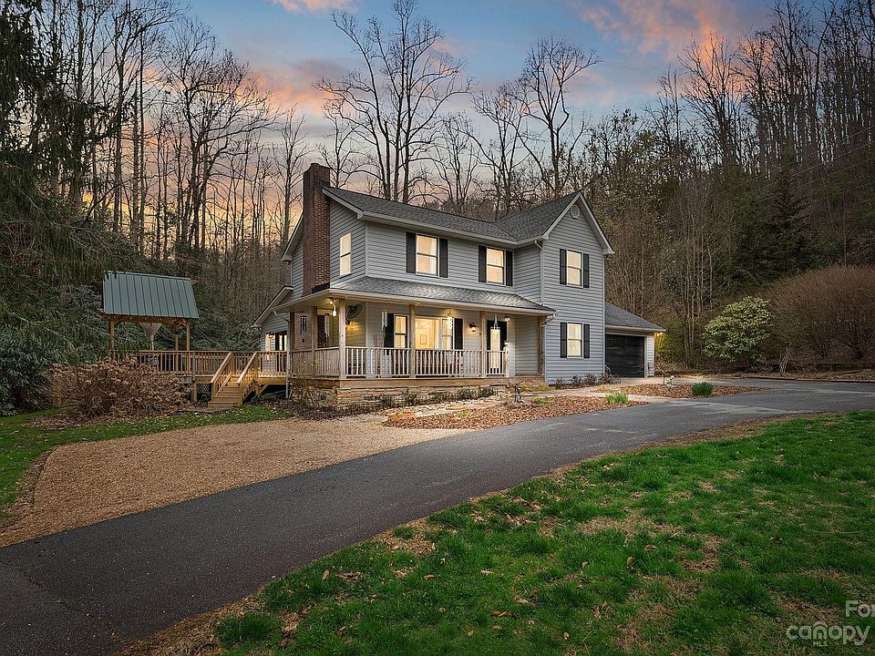 Meticulously maintained 2 story home on a flat 2 acre lot with a beautiful creek and thoughtful landscaping. Bamboo floors and crown molding throughout. Updated kitchen features built-in pantries and new countertops. Dining area includes a custom dry bar and skylights. The living room has a cozy wood burning fireplace, and opens seamlessly into the den with soaring tongue and groove ceilings and a bay window overlooking the fenced backyard with a fire pit. Imagine yourself hosting, grilling, or relaxing by the creek on the wrap-around porch complete with a pavilion. A gate and charming wooden bridge give way to a peaceful wooded path and clearing. The fully insulated accessory building has electricity and WIFI, making it a great potential workshop or office. More features: high-def security system, small apple orchard, parcel drop box, and automatic privacy gate. Add’l improvements in MLS. Approx. 20 min drive to Asheville. NO HOA would be a great vacation home or short term rental!