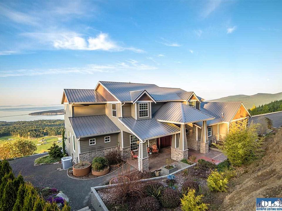 Top of the world views from one of the finest homes ever to come up for sale in Sequim. Supreme design, craftsmanship, and materials befitting of a view that will make you gasp upon first sight. Careful thought was put into every inch of this 3 story home, all connected by elegant stairs or your own elevator. Meticulously built by the most talented craftsman and contractors in our area and located in a gated community, the home mixes style with functionality and technology seamlessly. Pure genius!